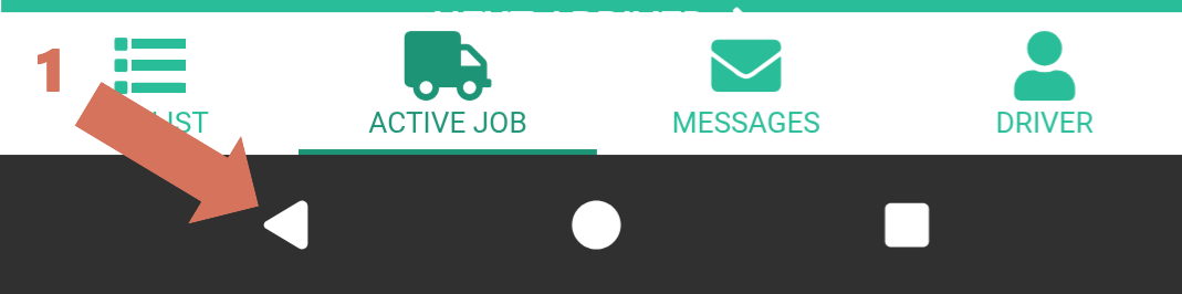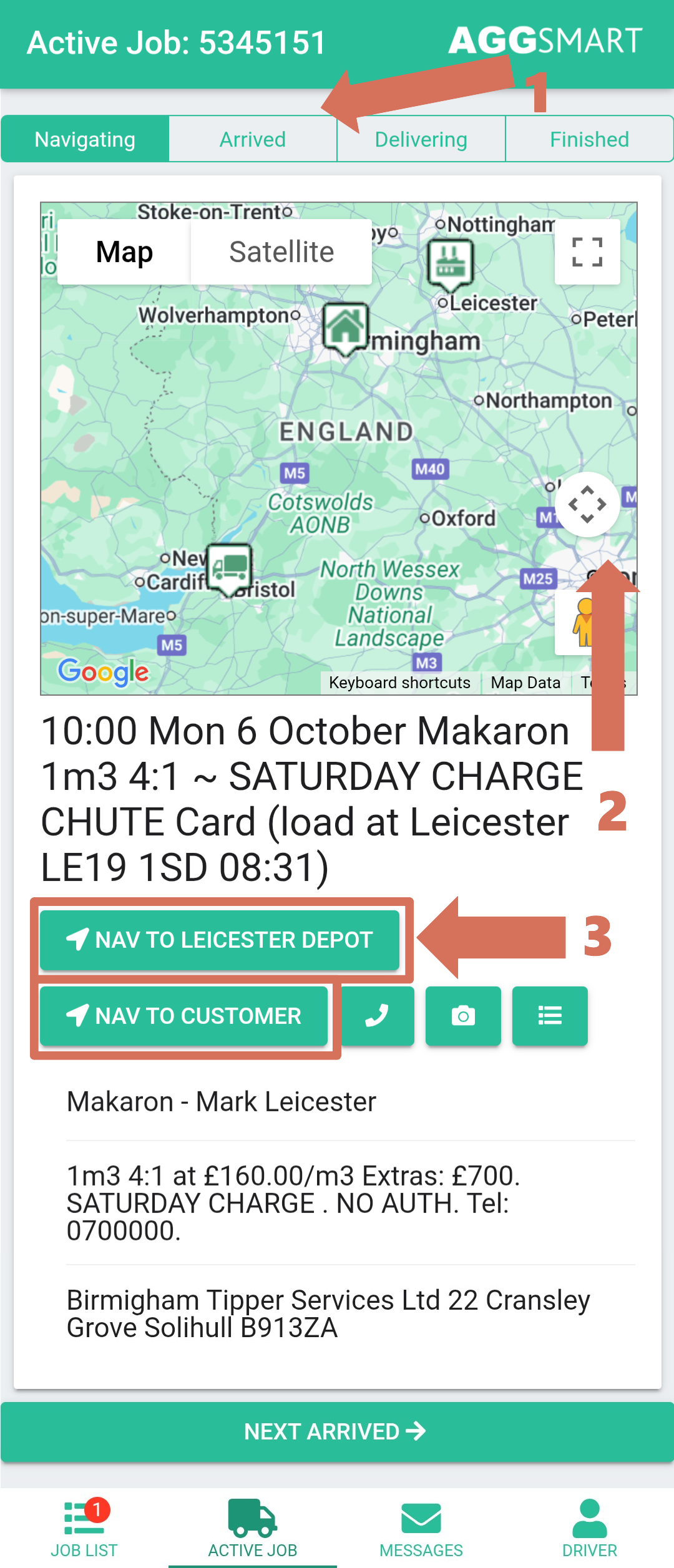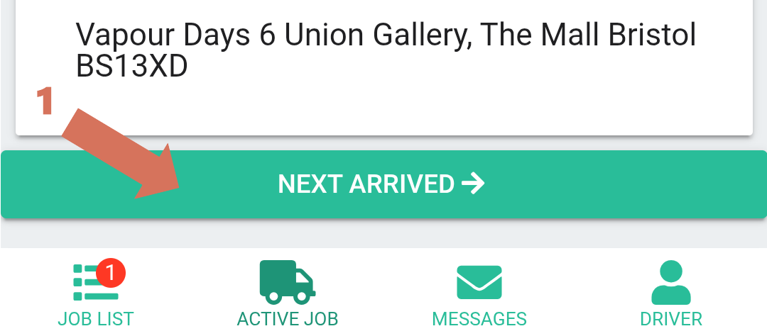 5) Now tap the green "NEXT ARRIVED" button at the bottom of the screen to progress to the "Arrived" stage of the job. |