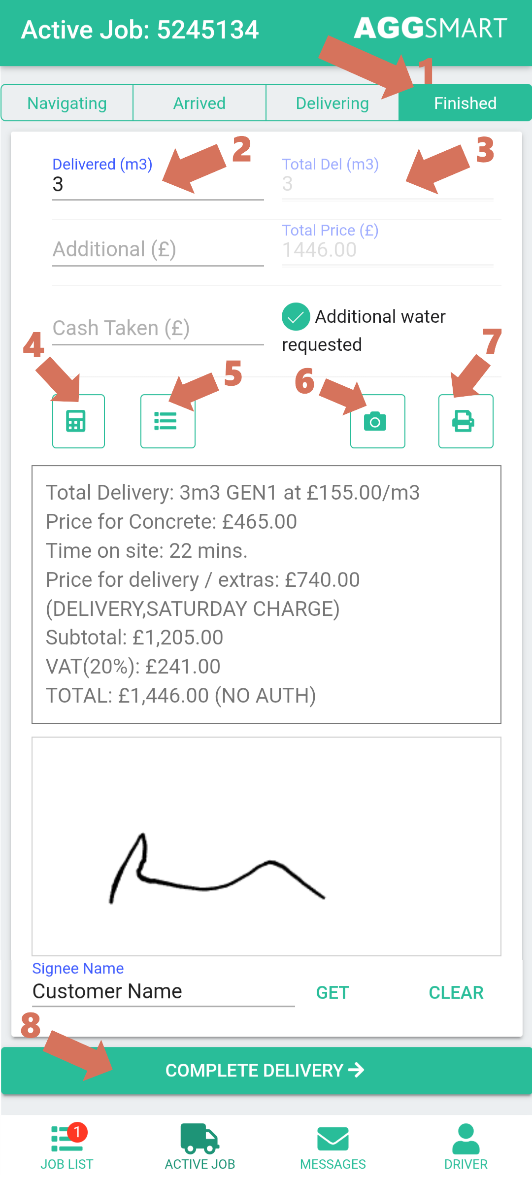 This is the "Finished" stage screen (Arrow#1). At this stage you are entering what you individually have delivered into the "Delivered" box on the left side of the screen (Arrow#2). When you enter the amount you have delivered, the "Total Del" (Total Delivered) and the "Total Price" fields should automatically calculate and be filled in. If not, press the "CALCUALTE" button (Arrow#4) "Total Del" is the sum of all the deliveries in the order. This will always be the same as "Delivered" for single delivery jobs. If you are the last delivery of a multiple load job, the "Total Del" value will show the accumulation of all deliveries. It will also show a full price breakdown (if this is a cash customer). If you are not the last delivery on site for this job, you can just get the customer signature, enter BSI details (see below for more details) by tapping the three lines icon (Arrow#5) and print off an optional receipt (Arrow#7). You can then tap "COMPLETE DELIVERY" button (Arrow#8) to finish the order. You can also optionally take another off-site photo to prove you have left the site in the same condition you found it by tapping the camera icon (Arrow#6). If the price details need amending, get office to do this and you can then press the "CALCULATE" button (Arrow#4) again to add the new details. If you need to add an additional amount, you can enter this in the “ADDITIONAL” field and press the "CALCUALTE" button again. If you are in a poor mobile signal area, pressing "CALCULATE" might bring up the message "Please contact office". If this happens, moving to a different area on the site (or out of any metal portacabins) usually helps. You can try pressing "CALCULATE" more than once to see if it gets a signal, but wait 10s between presses. If you still cannot get a signal, you'll need to call the office to get a total of the amount delivered and a total price. You then need to enter this manually on the right column on the device (Arrow#3). |