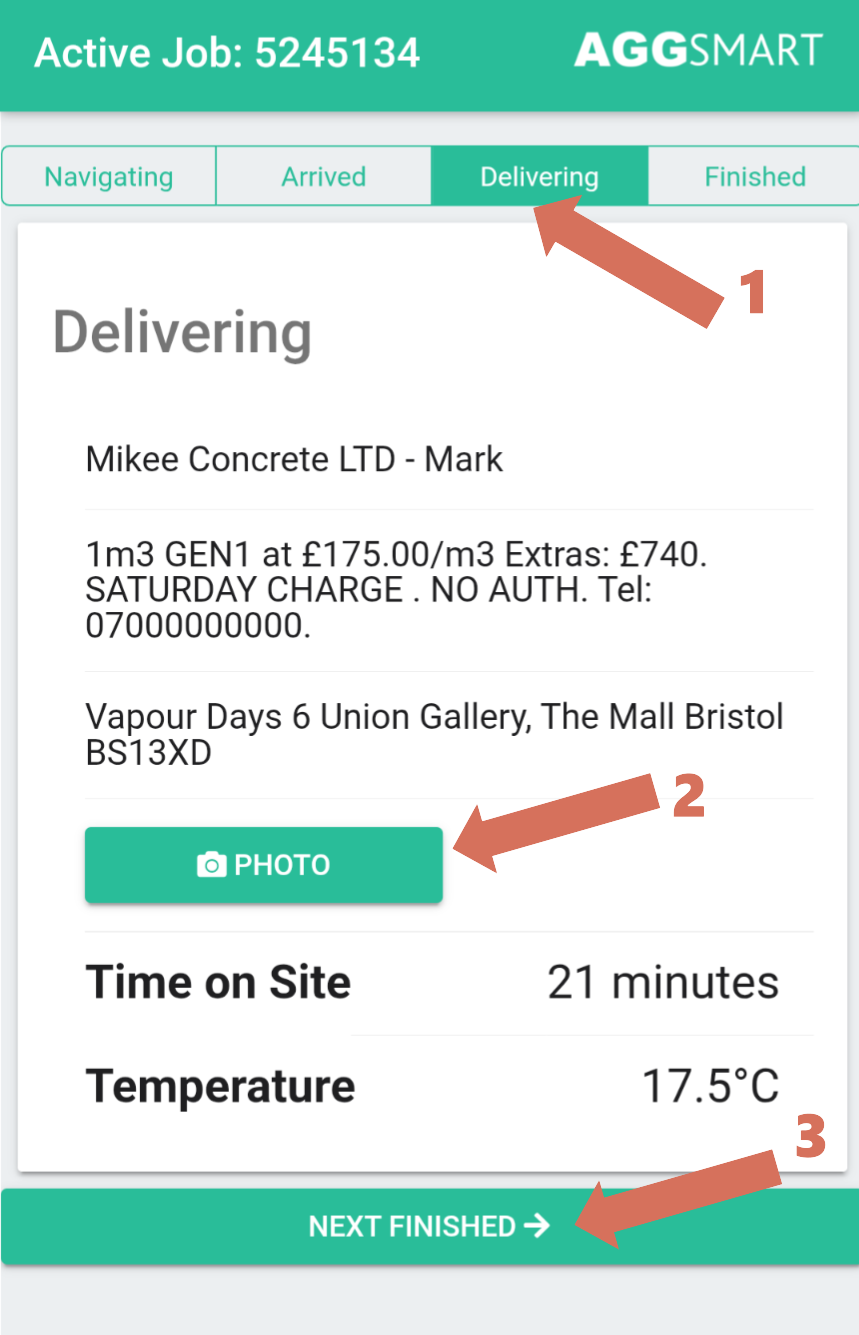This is the "Delivering" stage screen (Arrow#1). Leave the AGG NAV app on this screen until the delivery has finished. You can also take photos using the "PHOTO" button (Arrow#2) at this point, whilst the delivery is taking place. Once the delivery is complete, tap the "NEXT FINISHED" (Arrow#3) button at the bottom of the screen to progress to the delivery complete stage of the job. |