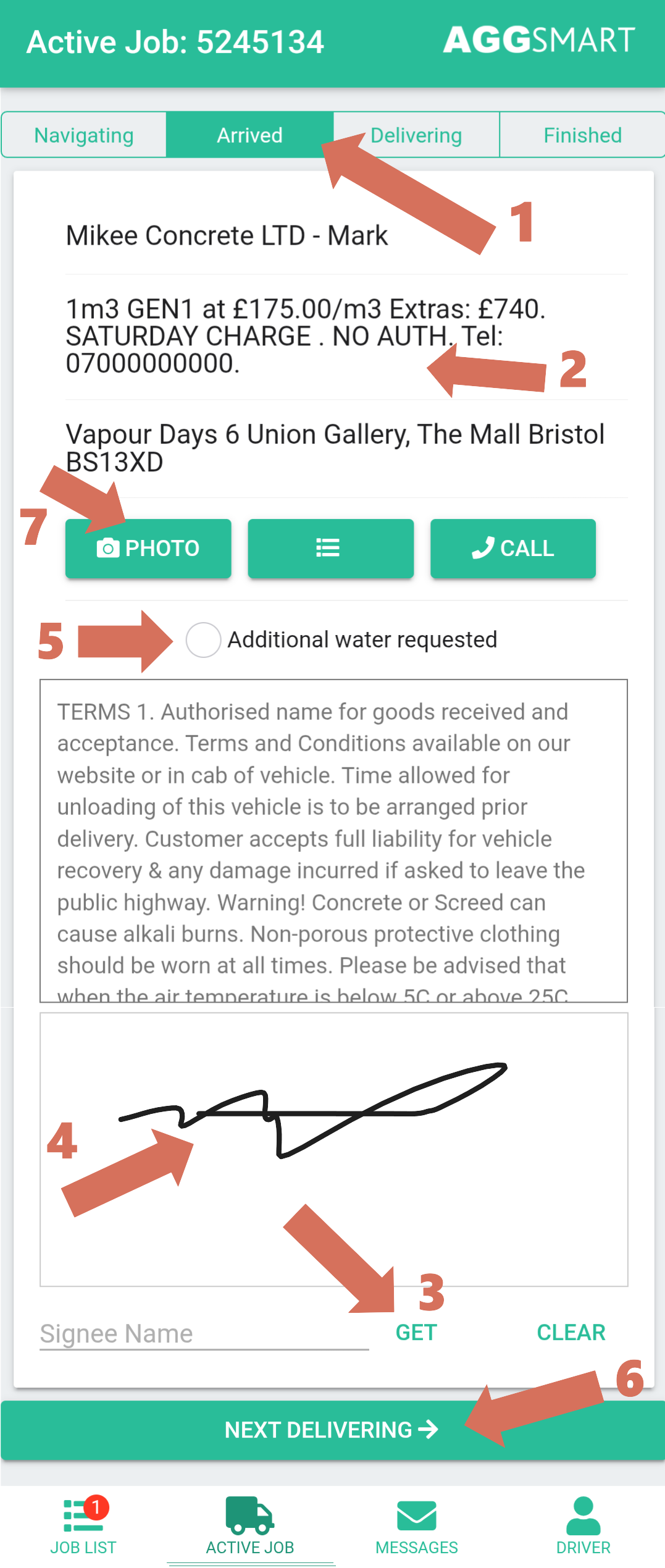 This is the "Arrived" stage screen (Arrow#1). This is to be signed by the customer (or site foreman) BEFORE you attempt to bring the vehicle off road. The signee's name is typed in at the bottom of the screen, or you can click the word "GET" next to this line, to pull the site contact name directly from AGG SMART (Arrow#3). However, for this signature to be legally binding, the name entered must match that of the signee (Arrow#4). You can now also take an on-site photo by tapping the "PHOTO" button (Arrow#7) either for proof-of-delivery purposes, to prove you have left the site in the same condition you found it or both. The "Order" text (Arrow#2) will provide information on the order. If a credit card has been pre-authorised, you will be shown how much concrete you can deliver before the pre-auth amount is reached. If you reach the pre-auth amount, then the customer should call the office for a 2nd pre-auth before delivery re-commences. If the customer requests additional water at this point, you can tap the "Additional Water Requested" checkbox (Arrow#5) above the terms box, to register this. The customer will then need to read the terms and conditions and sign on the device to agree and accept them. Once signed, tap the green "NEXT DELIVERING" button (Arrow#6) at the bottom of the screen to progress onto the delivery stage of the job. |