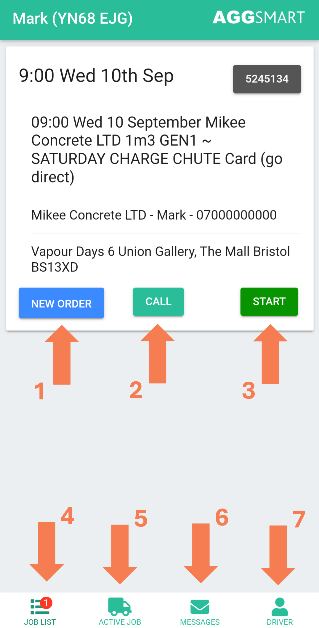 Once you've logged into the vehicle, any new orders sent to the vehicle will appear in "Job List" screen. This screen is shown by default once you login to the app and you will see your list of jobs ordered by date and time, with the next job at the top of the list. It is important that you start the order before you drive to the delivery location. 1) Order Status - The current status of the order. Though it looks like a button it can't be tapped or clicked. 2) Call Button - You can tap this to call the customer's site contact number on the order. 3) Start Button - Tap this when you are ready to begin the job. This can be clicked before loading. 4) Job List - Tap this come back to this screen at any time. 5) Active Job - Tap this to view the job you are currently working on. It is only available when you have an active job running. 6) Messages - Tap this to access the two way text message service from the office to the truck. Messages sent from the office will be read out on the device and will also appear in this section. You can reply to and delete messages from here. 7) Driver - Tap this to access options relating to the driver, navigation and application. This screen is explained in more detail below. |