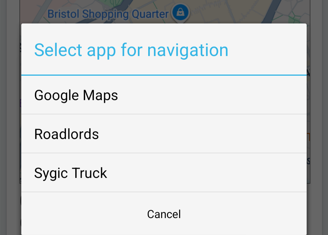 The first time you navigate to a job AGG NAV will ask you to select the navigation app you would like to use to get you to your destination. The options displayed here depend on what navigation apps you have on your device. In the example to the left we have Google Maps, Roadlords and Sygic Truck available to us, however you may see different options. If you would like to use a different navigation app then download it from the Google Play Store and it will appear in this list. | ||||||||||