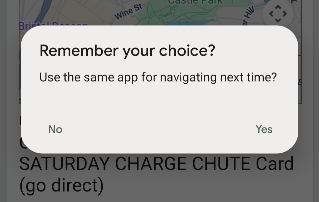 Once you've selected your preferred navigation app, AGG NAV will ask you if you would like to remember this choice for next time. With that decision made you will be taken to your navigation app of choice to begin your journey. | ||||||||||