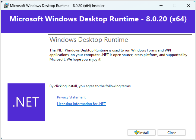 8d) The installation of the .NET Desktop Runtime should now be complete - click "Close".