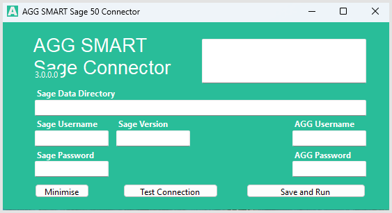 With the AGG SMART Sage Connector installed and opened you should now see a screen matching the screenshot below: