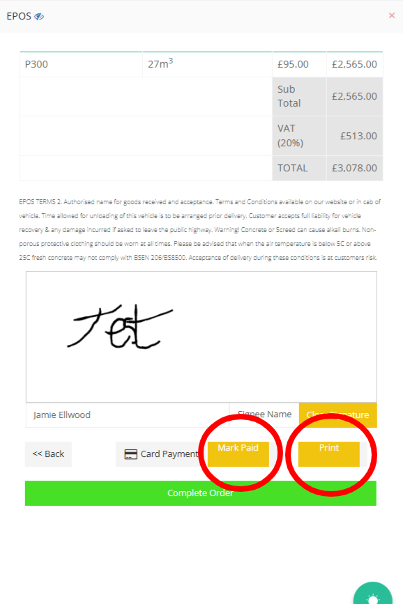 Step 35: Once the payment has been Authorised we can click the "Not Paid" button to switch this to "Mark Paid" to store a label that the payment has been made. By default the "Print" option for the invoice will be enabled - if you don't want to print the invoice just press the "Print" button and wait for it to change to "No Print" to confirm this change.