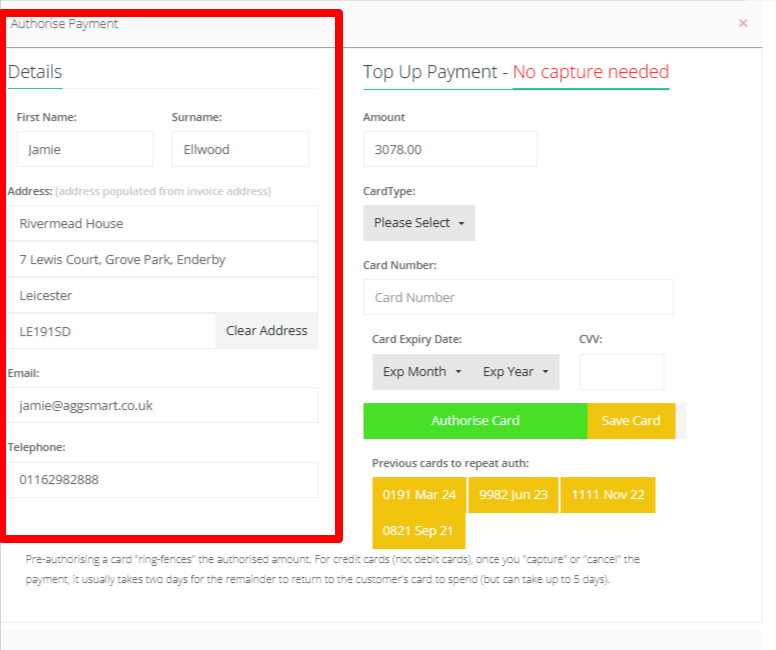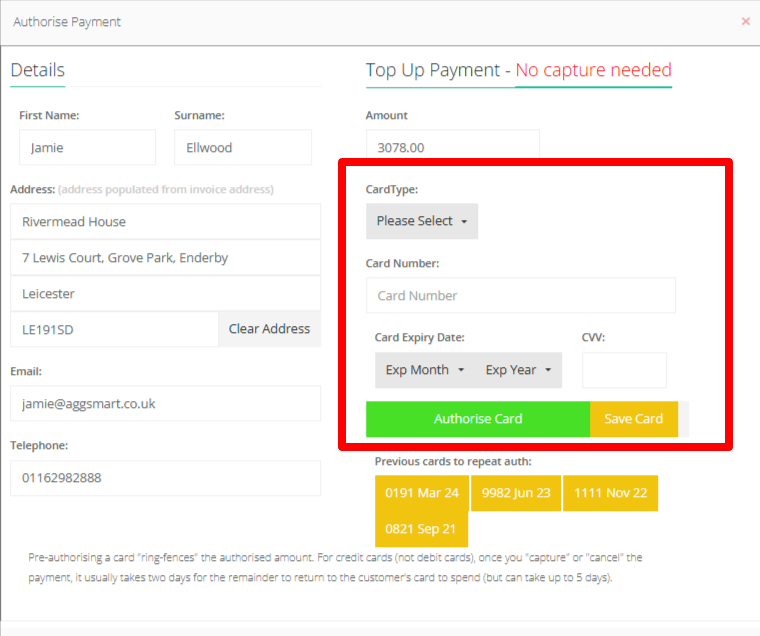 Step 34: Input the card details next: Select the CardType, Input the Card Number, Card Expiry Date, and the CVV then before selecting Authorise Card you can select to "Save Card" for future orders - once this is pressed "Save Card" will switch to "Don't Save" which is correct and confirms the card details will be saved.
