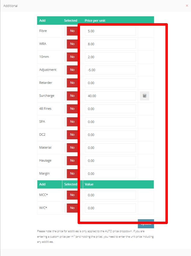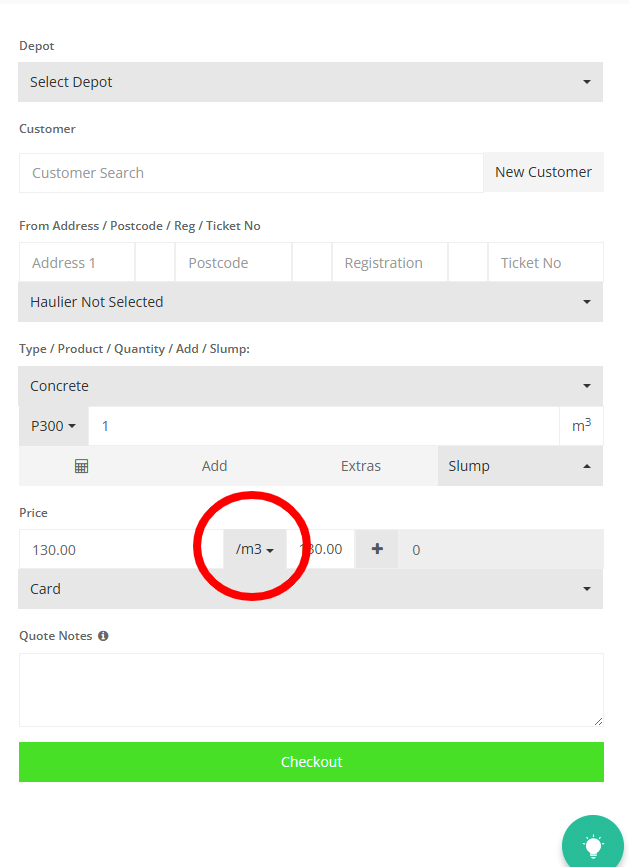 Step 26: Select the "/m3" button to view the drop down with the generated pricing options for the product.