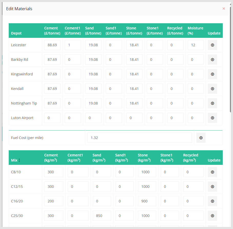 The Edit Materials Screen is very easy to update. You simply need to enter the value into the correct box and press the grey button with a circle inside of an arrow, at the end of the row, to ensure the data for that row has been updated.