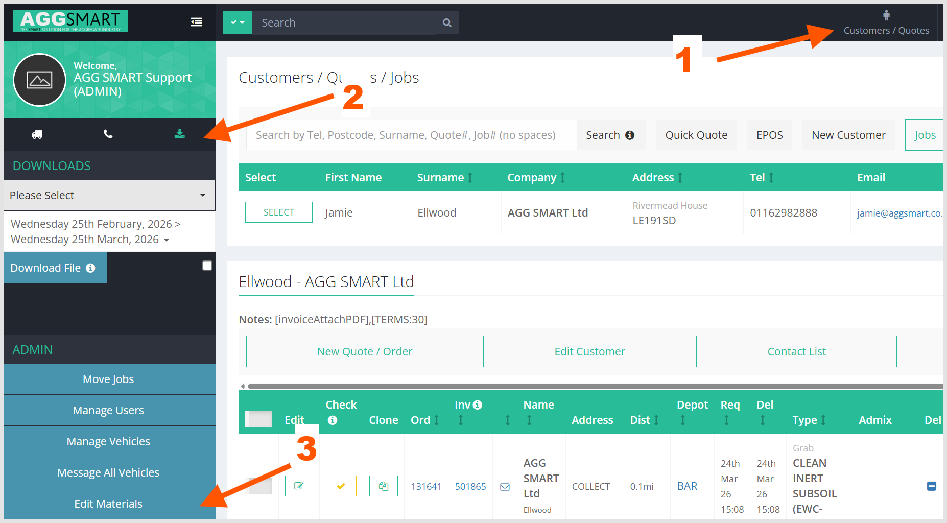 1) Click Customers / Quotes in the top navigation bar, as shown in the screenshot below (Arrow#1).